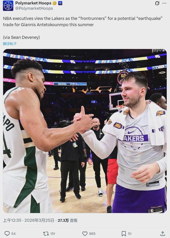 今年3月25日,The Athletic名记Sam Amick报道,雄鹿和字母哥预计今年夏天分道扬镳。字母哥的合同3年1.75亿美元,2027-28赛季球员选项,2027年夏天能跳出合同。2026年10月1日起,字母哥有资格4年2.7亿美元提前续约。