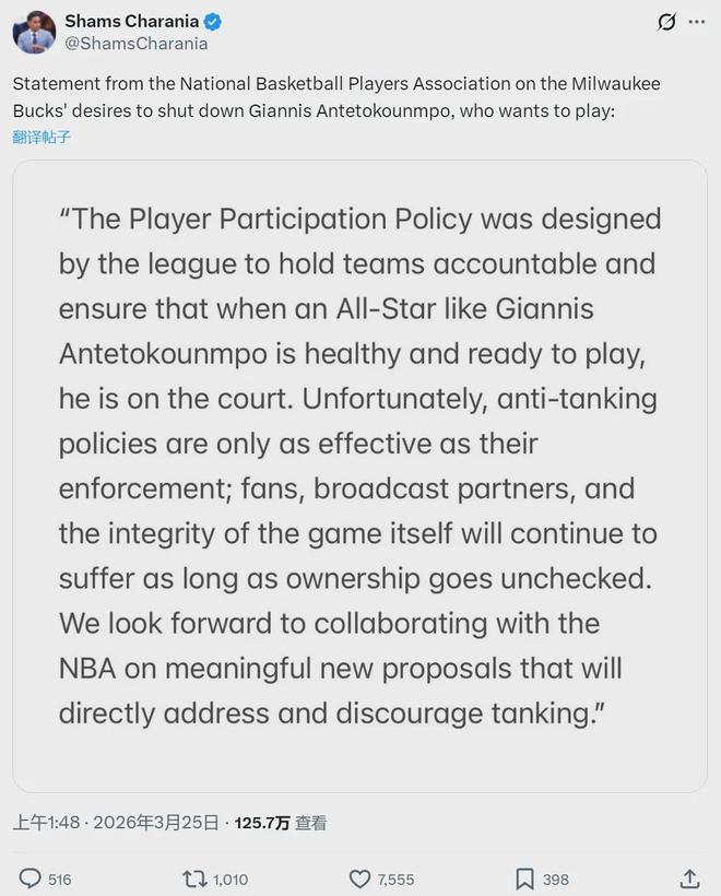 字母哥连续10年打进季后赛,如今被终结。字母哥仍在尝试复出,关于是否赛季报销的问题,他跟雄鹿管理层已经闹翻。今年3月25日,球员工会发表声明:“反对雄鹿让字母哥赛季报销!我们要确保他这样的球星在健康时能够出战。”