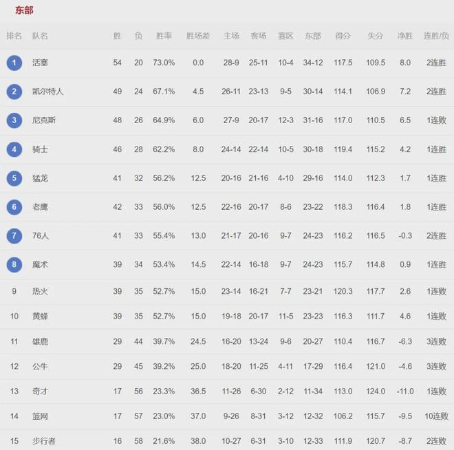 东部前十排名:活塞、凯尔特人、尼克斯、骑士、猛龙、老鹰、76人、魔术、热火、黄蜂。西部前十:雷霆、马刺、湖人、掘金、森林狼、火箭、太阳、快船、开拓者、勇士。加粗的是附加赛区,常规赛还剩8场左右,依然存在变数。