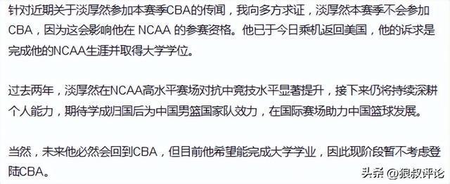 但是最新的情况有变,淡厚然改变计划,不打算参加CBA,并于今日启程返美,继续追求NCAA生涯和大学学位。