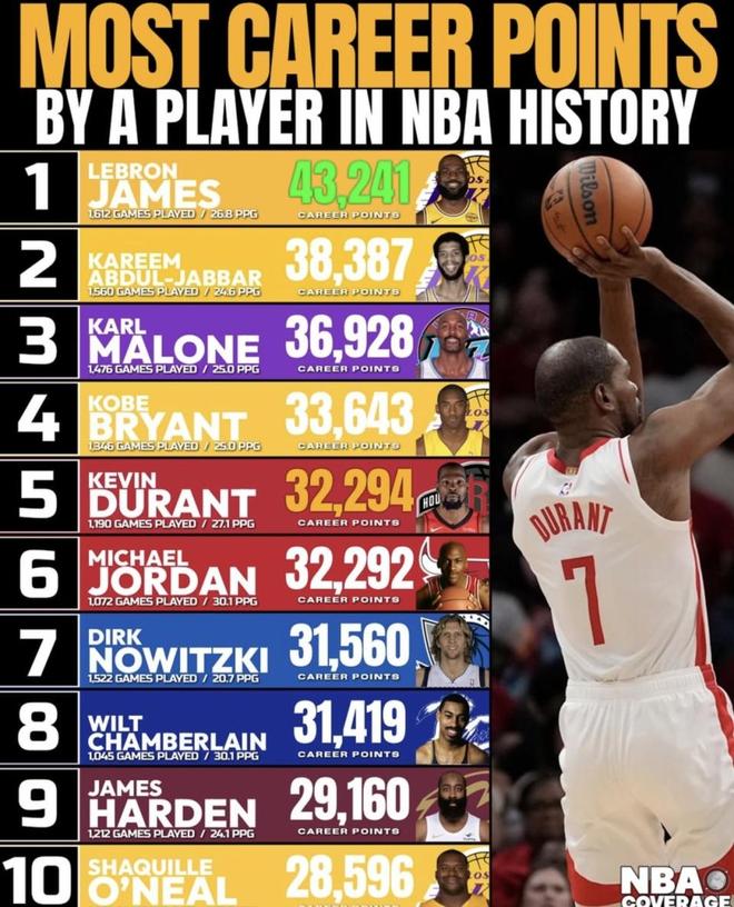 杜兰特和哈登都到了生涯末期,退役前在NBA历史得分榜上能排第几?杜兰特目前历史第5,距第4的科比只差1349分,超越只是时间问题。但最大的悬念是:他还能填平4600多分的坑去冲第3吗?哈登目前历史第9,转型后得分速度正在变慢。面对前面的张伯伦、诺维茨基和乔丹,他的极限到底在哪?