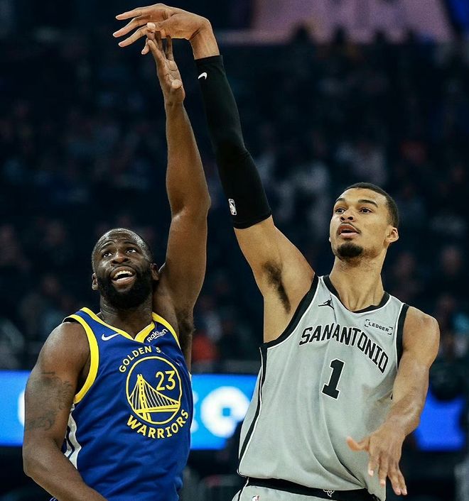 马刺队内外兼施赢得干净利落脆,文班亚马延续着神勇的发挥。从首节比赛开始,文班亚马就展现了极强的进攻欲望,单节17分9板,制霸禁区,为全场比赛奠定基调;在勇士队反扑凶猛迫近比分的第四节,又是文班亚马挺身而出为球队稳住局面!全场比赛下来,文班亚马仅出战28分钟,22投16中(三分球6中2),罚球8中7,狂轰41分+18篮板+3助攻+3盖帽的豪华数据,场上正负值高达+16。与此同时,文班亚马一战刷爆多项NBA纪录,包括3项前无古人的NBA纪录。