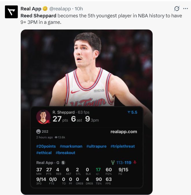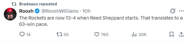 休媒Roosh写道,本赛季谢泼德先发时火箭13胜4负,换言之火箭队本有希望拿到63胜。(除此之外谢泼德拿到20分的比赛有12场火箭拿到9胜3负,火箭也有62胜)