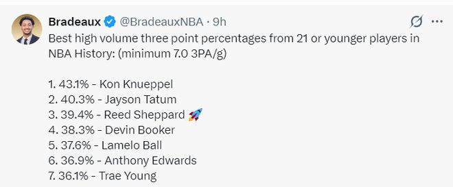 5.21岁及以下场均出手至少7次三分的球员里,谢泼德命中率39.4%排历史第三;