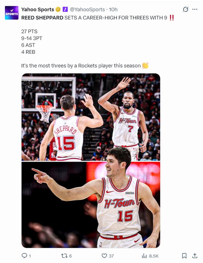2.谢泼德单场9个三分是本赛季火箭球员最多;