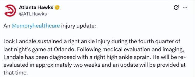 据老鹰记者布拉德-罗兰德透露,虽然老鹰没有正式宣布兰代尔赛季报销,但距离4月13日常规赛结束只剩10天。按照球队给出的恢复时间表,他基本不太可能出战老鹰最后5场常规赛。