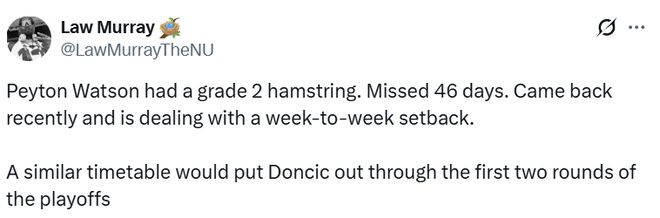 洛城记者Murray表示,佩顿-沃特森也曾是二级腿筋拉伤,缺席了46天。近期刚复出,又出现反复,目前仍处于每周观察状态。按照类似的恢复时间表推算,东契奇可能会缺席季后赛前两轮的全部比赛。