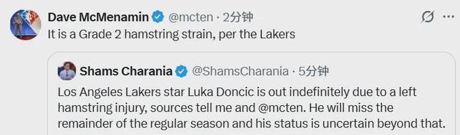 北京时间4月4日,ESPN记者Shams爆料,湖人当家球星卢卡-东契奇因为左腿筋伤势无限期休战,可以确定的是东契奇将缺席剩余所有的常规赛。Shams作为后沃神时代最权威的记者,他的首发意味着给湖人队宣判了死刑。