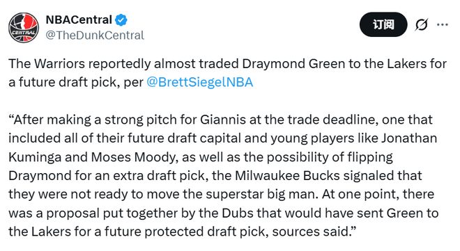 名记西格尔透露,勇士当时在全力梭哈追求字母哥,不仅愿意送出年轻筹码和未来选秀权,还一度向湖人提出用格林换取一个未来受保护选秀权的报价。