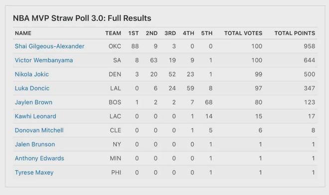 NBA官网的MVP排名,并不意味着最终一定会获奖。不过今年的MVP评选,已经成了文班和SGA的二人转。ESPN近日邀请100位体育媒体人,对常规赛MVP进行了模拟投票:亚历山大获得了88张第一选票,总得分958分遥遥领先。