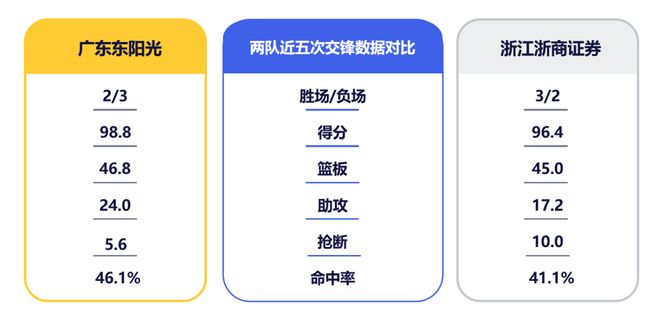 目前,广厦队防守效率排在联盟第二,然而上一场失利正是因防守出现漏洞。本场比赛,相信对手会在防守端做出调整,全力争胜,广东队进攻端将面临考验。一方面,需加强团队协作,争取通过内外联动保持自身火力输出;另一方面,则要注意提速反击,利用速度优势冲击对手防线。而在对方高压防守之下,球队在场上还要有足够的耐心,注意传球配合与细节把握,减少不必要失误,慎防场均抢断高达8.2次的对手利用失误轻易转化得分。