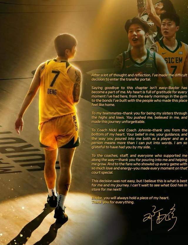 北京时间4月3日消息,中国女篮希望之星邓雨婷于4月3日通过社交媒体正式宣布进入NCAA转校大名单(Transfer Portal),结束在贝勒大学的篮球生涯,引发国内篮坛广泛关注。这位22岁的中国女篮潜力新星,是首位以常规轮换身份随队闯入NCAA“疯狂三月”第二轮的中国球员,其动向牵动着中国女篮未来锋线建设的期待。