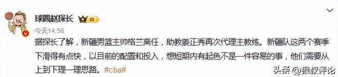 新疆男篮主帅格兰离任,助教姜正秀再次代理主教练。新疆队这两个赛季下滑得有点快,以目前的配置和投入,想短期内有起色不是一件容易的事,他们需要从上到下理一理思路。