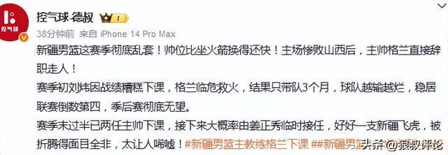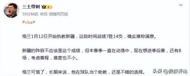 媒体人“三土带刺”发文点评:格兰1月12日开始执教新疆,这段时间战绩7胜14负,确实难称满意。