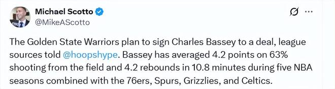 巴锡近期以两份10天短合同的身份为凯尔特人效力了20天。随着他在波士顿的第二份10天合同于周日到期,他已成为自由球员。随后,勇士决定签下他,来补强内线。