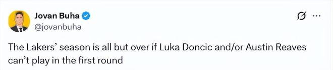 湖人队记Buha在社媒上表示,如果东契奇和 / 或里夫斯无法出战首轮,湖人这个赛季基本就提前结束了。大家怎么看?欢迎留言发表看法。