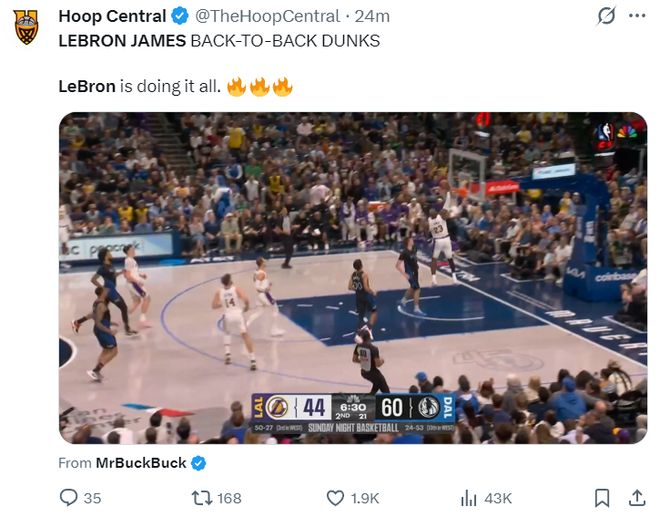 第二节的詹姆斯太厉害了,他以41岁的高龄单节两次暴扣,这一节他在10分钟里,7中6,三分1中1,罚球3中3,拿到16分3助攻,他也帮助湖人将分差缩小到7分。