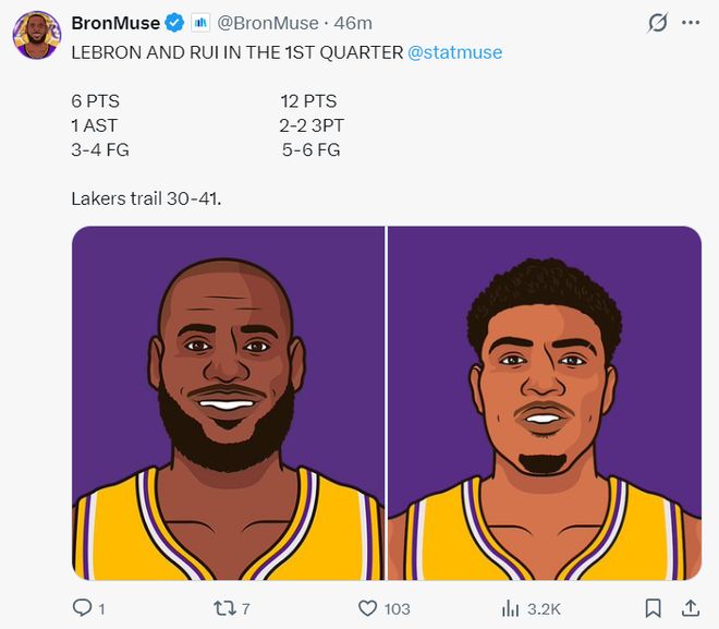 41岁的勒布朗首节8分钟里,4中3,拿到6分1篮板1助攻,八村垒首节6中5拿到12分,但湖人的问题是防守,独行侠首节狂揽41分领先湖人11分之多。