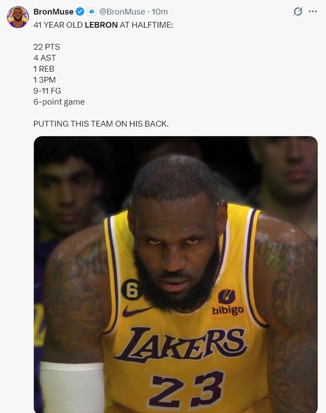 上半场41岁的勒布朗已经火力全开,11中9,三分1中1,拿到22分4助攻1篮板,湖媒盛赞死亡之瞳版本的勒布朗再度回归了。