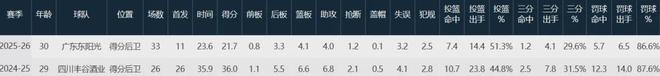 这哥们可是广东队的得分王,本赛季至今出战33场首发11次,场均上阵23.5分钟贡献21.7分4.1板4助1.2断,三项命中率51.3%、29.6%和86.6%。