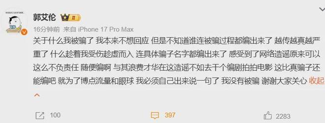 不过事情迎来了终极反转,郭艾伦发博明确表示自己没有被骗,都是不负责任胡编乱造的假新闻。