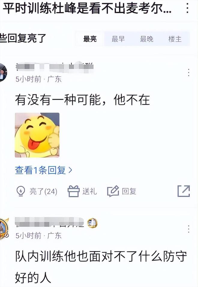 有球迷赛后发帖提问:平时训练杜峰是看不出麦考尔菜吗?评论区广东球迷给出了2条脑回路奇特但逻辑上完全说得过去的回答:1、有没有一种可能,他不在;2、队内训练他(麦考尔)也面对不了什么防守好的人。