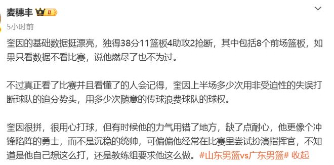 赛后媒体人付政浩谈到了这个问题,并且指出了这个致命要害:广东男篮负于山东男篮并不意外,毕竟萨姆纳和萨林杰两大外援休战,意外的是广东男篮的本土球员竟无一人能站出来。奎因独砍38分11篮板4助攻2抢断,但也被夹击逼出了8次失误,明显独木难支。