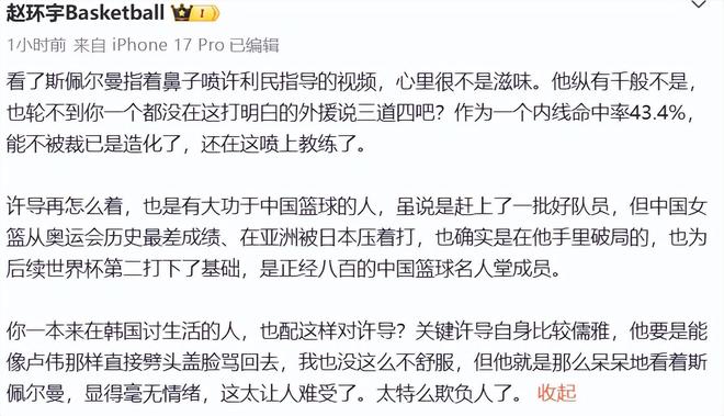 媒体人赵环宇也是直接发文开骂:看了斯佩尔曼指着鼻子喷许利民的视频,心里很不是滋味,他纵有千般不是,也轮不到你一个都没在这打明白的外援说三道四吧?作为一个内线命中率43.4%,能不被裁已是造化了,还在这喷上教练了。