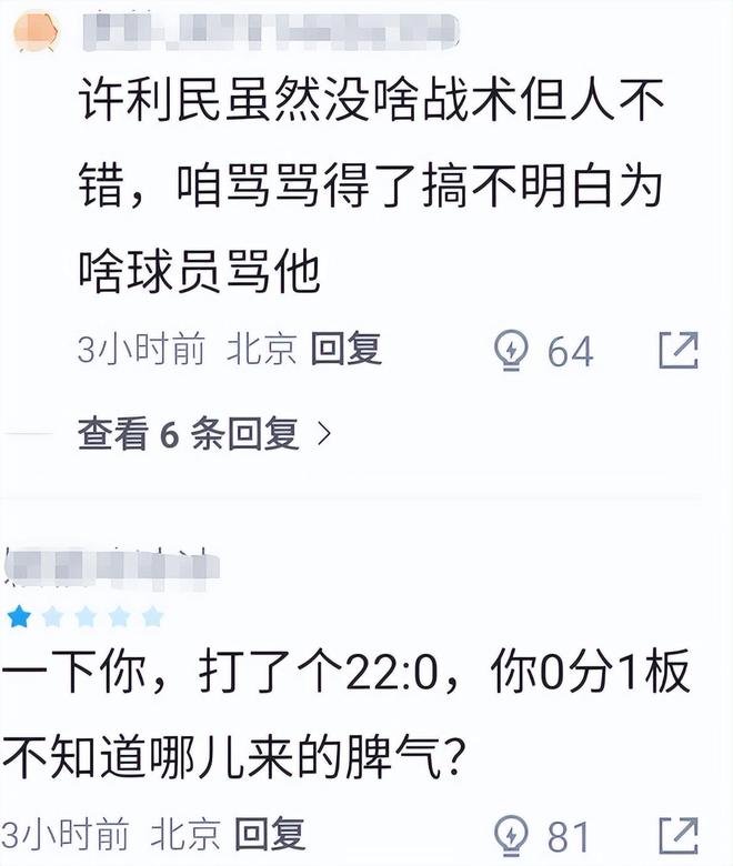 赛后球迷评论区,不少北京球迷也是就事论事对斯佩尔曼表达了不满,力挺许利民:虽然许利民一直不咋样,但是今天你也没有资格指着他骂啊。典型的水平菜脾气大!许钟豪说得没错,叫你是来打球的,不是来装的。一下你,打了个22:0,你0分1板不知道哪来的脾气?