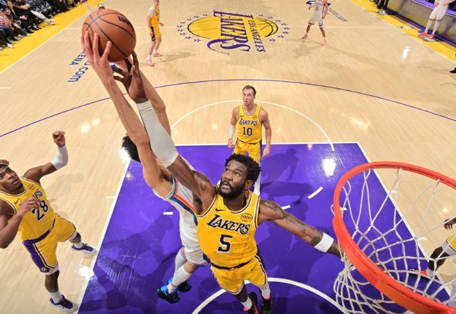 中段卡鲁索和麦凯恩三分球稳定节奏,湖人则依靠肯纳德屡屡回应。后半段雷霆再度发力,亚历山大错位单打艾顿,华莱士造杀伤后,撤步强投三分,此后亚历山大继续点名艾顿,半场结束时,雷霆65-47领先湖人。进入下半场,八村塁转换扣篮,肯纳德挡拆中投,霍姆格伦内外开花,多特续上三分球后,霍姆格伦晃飞艾顿再度打成2+1!中段雷霆连续罚球,亚历山大追身三分再中,19分听牌,场上分差到27分!后半段伊塞亚乔续上三分,亚历山大突破抛投,又一场20+!亚历山大继续上篮+反击劈扣,三节打完,雷霆93-62湖人。