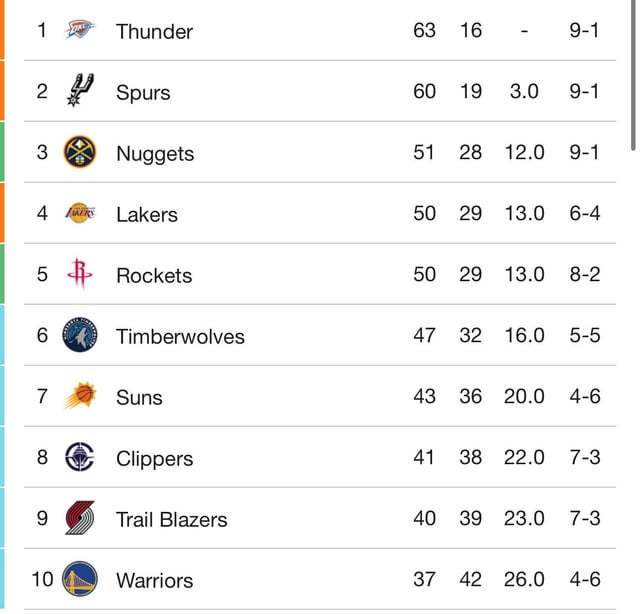 西部排名这潭水,火箭又搅浑了一层。过去7天他们连克勇士和太阳,战绩直接追平湖人。现在两队同为48胜34负,湖人手里只剩3场常规赛,却要面对勇士、太阳、爵士三个对手——没有一场能躺。
