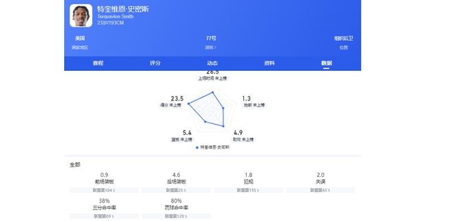 本赛季32次出场,他场均22.9分4.3篮板6.7助攻,其中得分联盟第四、助攻联盟第二,同时14场比赛打出关键数据,累计关键得分74分。