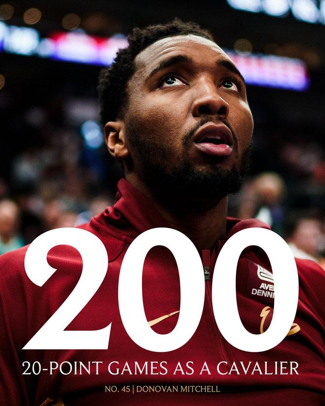 本场比赛也是如此,米切尔19中12轻松砍下31分7板4助1帽,正负值+20全场最高,凭借这样的表现,米切尔骑士生涯已经200次拿下20+,成为骑士队史第5位做到这一点的球员,比肩詹姆斯、布拉德-多尔蒂、欧文和奥斯汀-卡尔。
