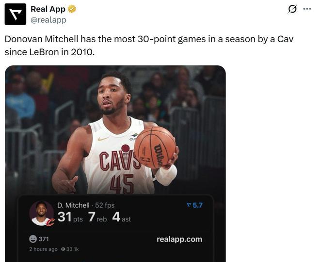 同时这是米切尔本赛季第34次砍下30+,成为骑士队史自09-10赛季詹姆斯以来,单赛季砍下30+场次最多的球员。