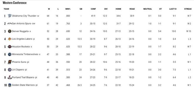 目前西部第3、4、5名仍未最终确定。10连胜的掘金距离锁定西部第3,只差1个胜场。湖人和火箭战绩同为50胜29负,两队很可能将在西部季后赛首轮交手,接下来最后的3场比赛,将是两队争夺主场优势的关键战役。