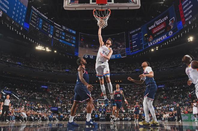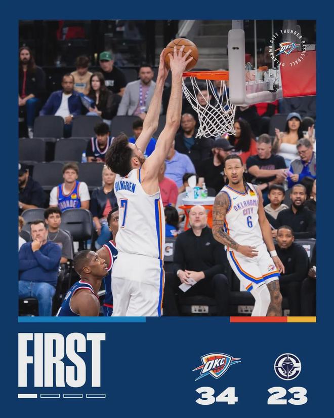 霍姆格伦连续送出暴扣,把快船内线打爆了。首节霍姆格伦只打了8分钟,6投5中砍下14分3篮板1助攻1抢断。本赛季杰威一直打打停停,事实上霍姆格伦已经打成了雷霆二当家。第一节打完,雷霆34-23领先快船11分。