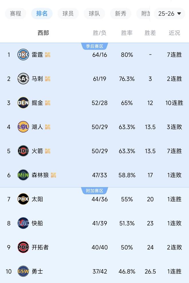 掘金队在主场迎战灰熊队,前者正处于9连胜中,后者正处于5连败中。两队从首节比赛开始就疯狂对轰,灰熊队一度占据上风。易边再战,场上风云突变,灰熊队进攻断电,掘金队单节轰出39-22的攻击波,一举拉开比分。末节决战,掘金队将分差拉大到20+,灰熊队大势已去。最终,掘金队以136-119大胜灰熊队。此役过后,掘金队豪取10连胜,这是联盟现存最长连胜纪录,也是掘金队自约基奇时代以来最长连胜纪录。如此一来,掘金队战绩来到52胜28负,排在西部第3位,领先第4的湖人队(50胜29负)多达1.5个胜场。除非湖人队神兵天降,否则,掘金队锁定西部第3只是时间问题。