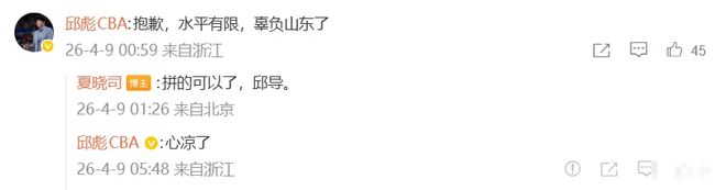 没想到,邱彪竟然在凌晨对这条信息进行了留言,他写道:“抱歉,水平有限,辜负山东了。”
