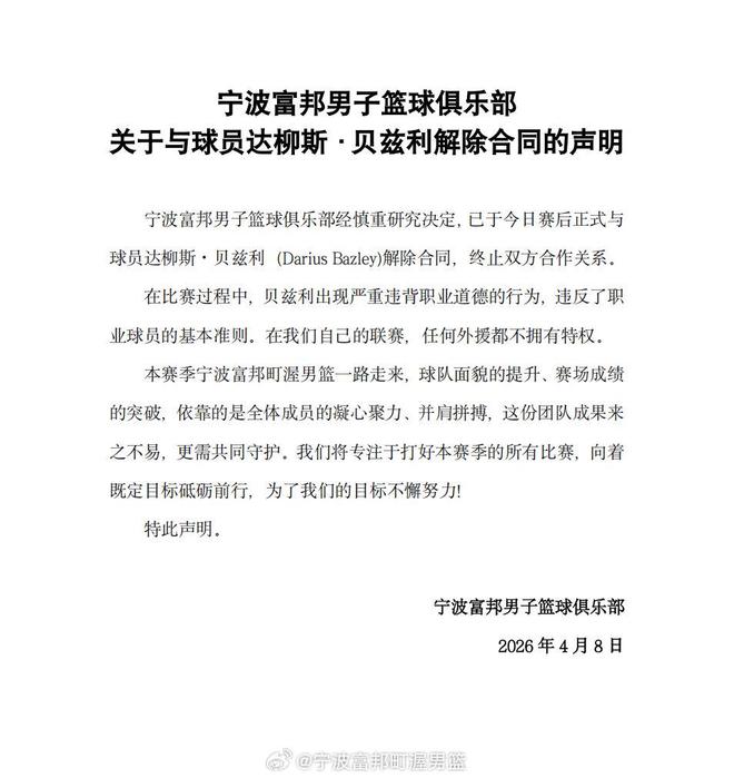 然而谁也想不到,在仅出战55秒的情况下贝兹利出现了不尊重比赛、不尊重队友和教练组、管理层等一系列问题,加上个人赛季表现一般,宁波队赛后第一时间与其解约也就不意外了。