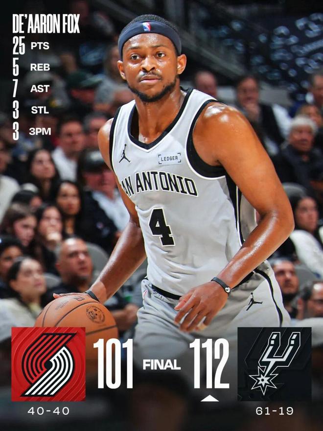 常规赛,马刺主场112-101战胜开拓者。