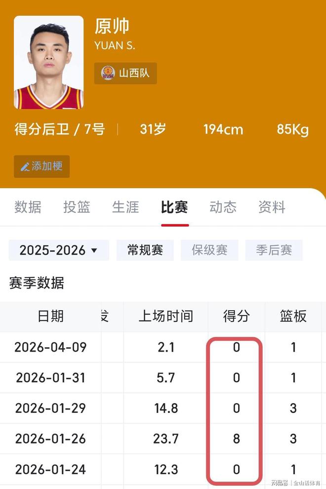说一说山西队顶薪球员原帅,本场比赛,厚帅继续着他的“稳定”发挥,全场三分球2投0中,数据为0分1板0助0断1犯规。由于状态糟糕,只打了2分多钟,就被换下坐在板凳上……