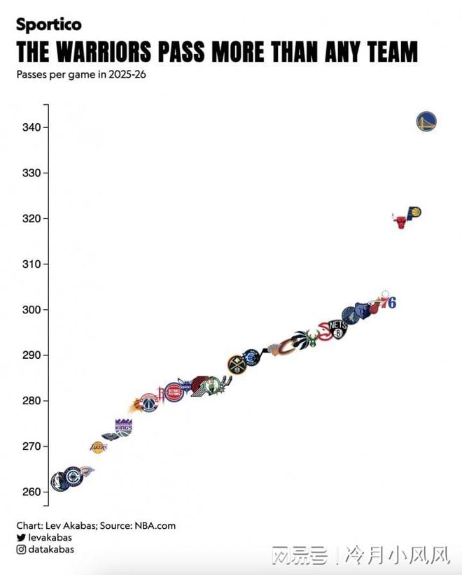 今日,美国体育媒体晒出了25-26赛季联盟30支球队场均传球数排行榜,结果显示金州勇士以340次高居榜首,印第安纳步行者和芝加哥公牛分列二、三位,快船则排在了倒数第二的位置,仅好于达拉斯独行侠。值得一提的是,截至目前,快船场均助攻23.8次,排在联盟倒数第一。