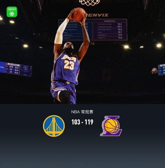 北京时间4月10日NBA 常规赛,金州勇士对阵洛杉矶湖人。本场勇士库里缺阵。上半场双方紧咬比分,半场勇士49-53湖人,下半场湖人逐渐将分差拉大,最大领先27分,最终湖人119-103轻取勇士。