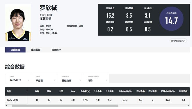 虽然在对阵四川的两场比赛江苏都输球了,可罗欣棫都拿到上双的数据,本赛季季后赛场均35分钟,拿到13分3.5篮板3.3助攻0.8抢断0.3盖帽,命中率47.5%,三分命中率33.3%。