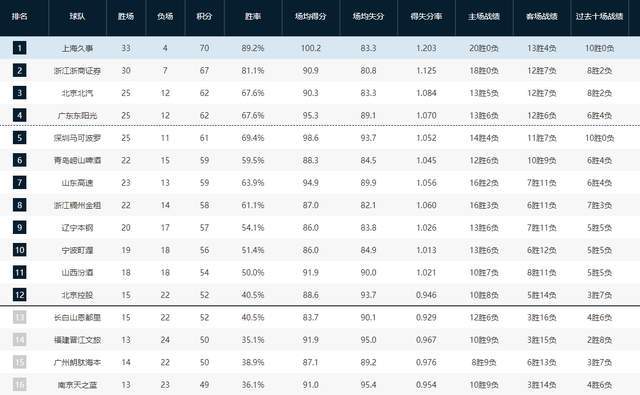 CBA常规赛已经打到第37轮,率先进行的五场比赛中,上海男篮119-116险胜福建男篮,青岛男篮98-96双加时力克辽宁男篮,广东男篮117-84大胜吉林男篮,北京首钢84-65轻取北控男篮,浙江广厦93-85逆转宁波男篮。经过这几场精彩厮杀之后,CBA积分榜又发生了全新的变化,上海男篮18连胜继续稳居第一,广东重返第四的位置,北京首钢杀到第三,辽宁男篮输球暂列第九名,北控男篮第十二名岌岌可危。
