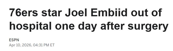 恩比德被确诊为阑尾炎后,于昨日接受了紧急手术。76人方面称,恩比德的术后恢复将由队医和主刀医生共同负责。ESPN列出了恩比德季后赛伤病史——