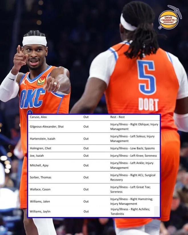 NBA规定每队至少8人出战,雷霆卡着下限凑了8人——多尔特带着一帮板凳末端和双向合同的哥们儿,硬着头皮上场挨揍