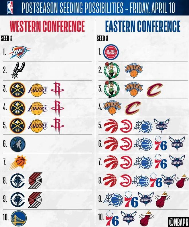 掘金、湖人、火箭依旧是345混战,不过掘金领先湖人火箭一个胜场,有先手之利,赢球保第3季后赛次轮刚马刺(首轮对森林狼也有一定风险),故意输球可保季后赛首轮捏软柿子湖人火箭。