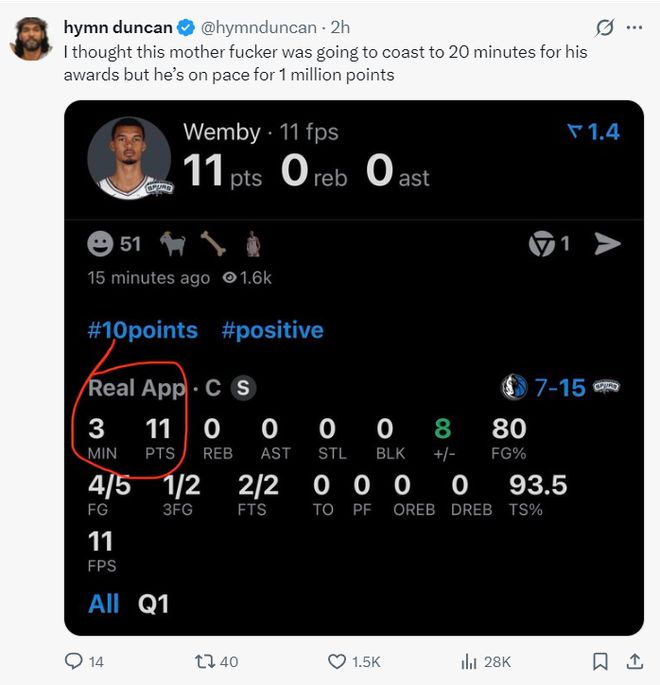 文班亚马此前因为肋骨的伤势缺席了一场比赛,此役他归来就炸裂,短短3分钟里5中4+三分2中1拿到11分,这得分效率太恐怖了。