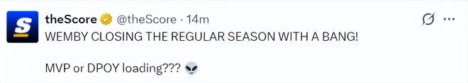 文班亚马还是本赛季的盖帽王,美媒The Score还力挺文班亚马拿MVP,他们希望文班亚马能拿到MVP+DPOY,本赛季文班亚马场均29.2分钟,拿到24.8分11.5篮板3.1助攻1.4抢断3.1盖帽,马刺则拿到60+胜场,文班亚马有望超越罗斯成为最年轻的MVP。